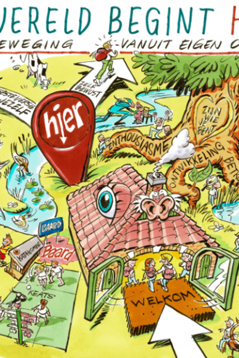 De leeromgeving van onze kinderen is gericht en ingericht met onze kijk op onderwijs. Ons onderwijs stopt niet bij de deur van de klas. Door ervaring leren kinderen het best. Daarom is onze buitenruimte ingericht als een leerplek waar de kinderen de groene en culturele omgeving waar ze in wonen kunnen ontdekken en onderzoeken. Onze binnenruimte zorgt voor ontmoeting, voor stilte, voor een rijke talige omgeving met leerkrachten en onderwijsassistenten die ervoor zorgen dat elk kind gehoord en gezien wordt. Jouw wereld begint hier!